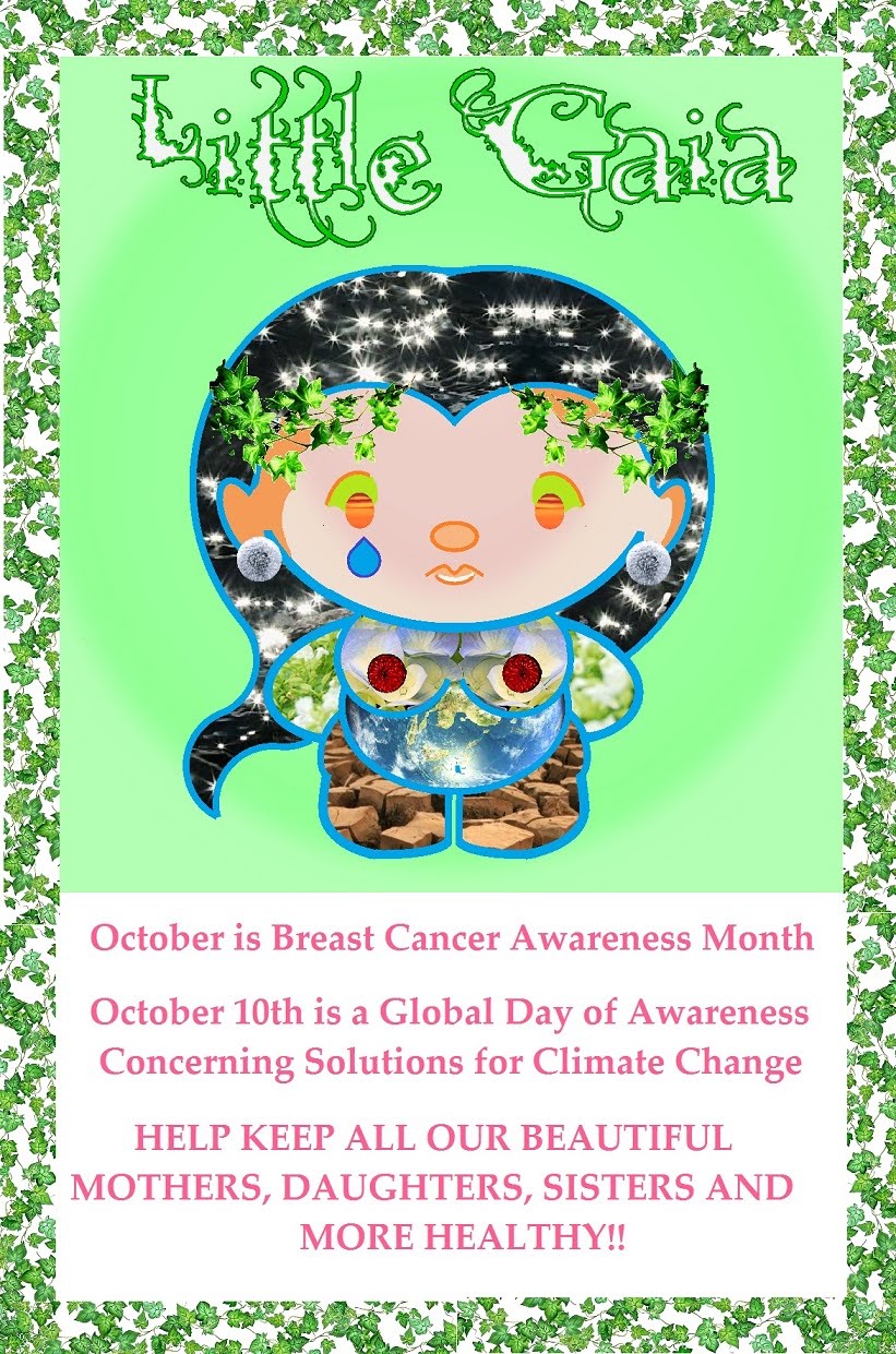 This one was actually done by special request. I wanted to combine both the activities for Breast Cancer Awareness Month with the Climate Awareness 'Work Day' on 10/10/10 (see 350.org for more info).In this case, my 'Gaia' has hair of sparkling water, an ivy wreath adorning her brow, sunset eyes, hyacinth breasts with sweet Chrysanthenams (sp?) through which she can feed her children, a lovely field of white flowers for arms and Our Home continuing to be guarded in her very womb. Wow, that was actually quite poetic!!